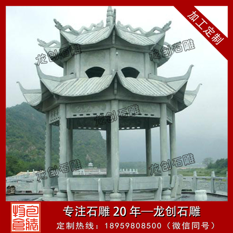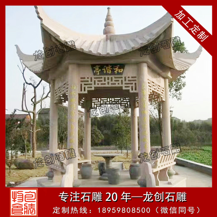 第三,必須通過各種雕刻手法,將石雕涼亭完美地展現(xiàn)出來。這一點是至關(guān)重要的。要完成一個石涼亭,有可能要用到圓雕、浮雕等多種手法,如果功夫不到家,是很難獨自完成一個精美的石涼亭的。