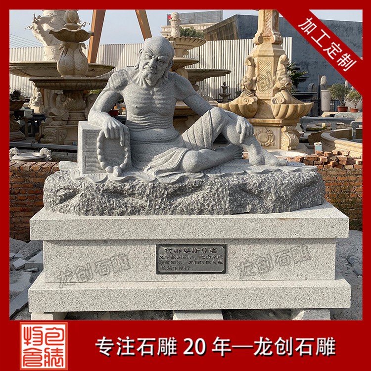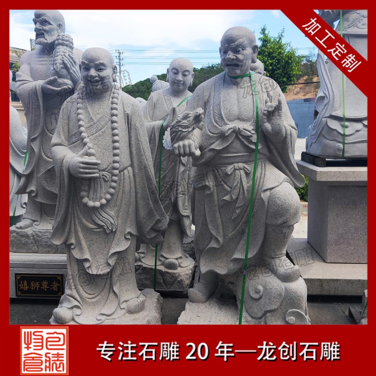佛教寺廟石雕十八羅漢雕塑一般采用天然石材加工制作而成,有花崗巖(芝麻白、芝麻黑、芝麻灰、蝦紅)、青石等,有的則會用漢白玉石材制作。用于室外擺放石雕十八羅漢像通常建議用花崗巖石材雕刻,按順序擺放在兩側。漢傳佛教的石雕十八羅漢隨著雕塑文化的發展,造型有立像、坐像、坐立結合的三種雕刻方式。從雕刻工藝上區分有浮雕、圓雕、透雕、線雕等,只要質量做工好,不論采用何種形式,都可以按照寺院的需求,很好的將十八羅漢文化表達出來。