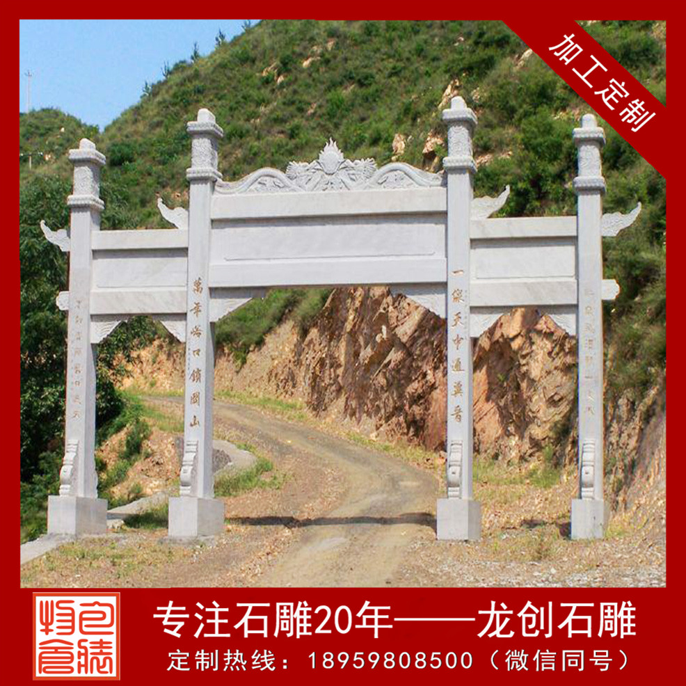山門牌坊是中國建筑藝術中的主要代表,也是傳統建筑形式,在中國漫長的歷史長河中更見設計魅力。山門牌坊的出現其實可以追溯到原始社會時期,氏族聚居的部落都會有這樣的門型建筑,早期的設計比較簡單,就是兩根柱子和一根橫梁,從木山門牌坊到石山門牌坊,石雕技術讓山門牌坊擁有了更為細膩的雕刻情感。龍創石雕山門牌坊廠家作為國內雕刻歷史悠久的專業專業雕刻廠家,提供了更多精致的石雕山門牌坊作品,讓其演繹雕刻工藝的文化傳統。