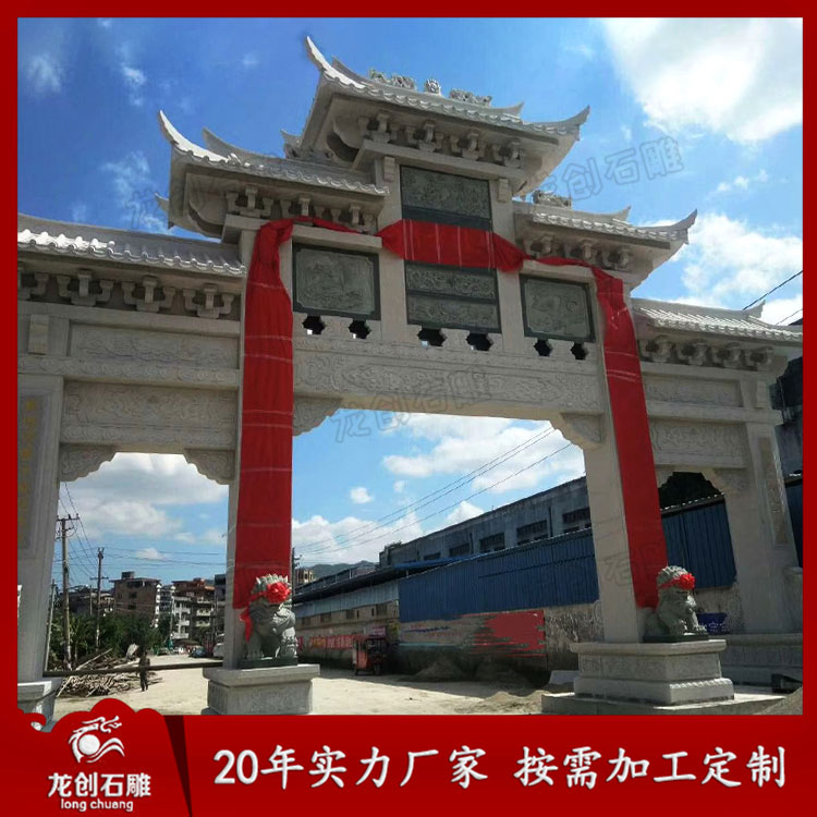 在生活中大型石雕牌坊制作安裝的場所挺多的,在新農村、風景區、寺院等地方都開始慢慢地建造大型石雕牌坊了。大型石雕牌坊在制作上采用了多樣化的雕刻工藝,雕刻制作出許多細致精湛的圖案,讓其與環境相互輝映,更具樸素質感貼近大自然。