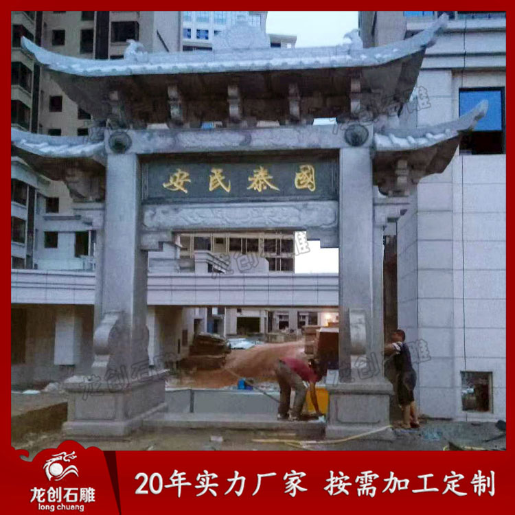下圖是三門三樓樣式的農村牌坊,也叫做農村牌樓,屬于經典傳統樣式,也是我們石牌坊廠家制作的比較多的一種,我們出廠的農村牌坊是設計、制作、安裝于一體的石牌坊廠家,我們注重石牌坊工藝和圖片樣式設計制作,每一步都追求精益求精,我們所制作的農村石牌坊秉承“以誠為本,以質量求生存”的經營理念,制作出超前富有創意的農村大門石牌坊,真誠為了美化農村環境,美化農村生活貢獻一份力量。