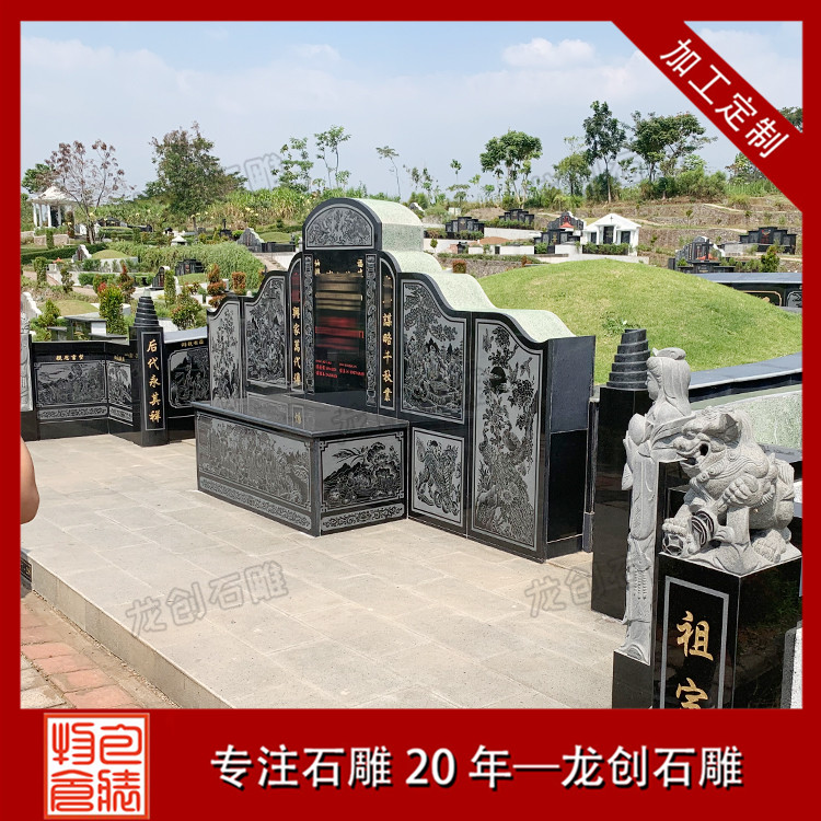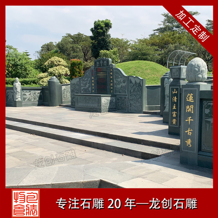 公墓墓園石雕墓套墓圍設計需要考察當?shù)氐膶嶋H情況,再設計出合適的樣式和尺寸,結合實際需求再設計浮雕圖案,像松鶴、鹿竹、蓮花、二十四孝等等吉祥如意的圖案。
