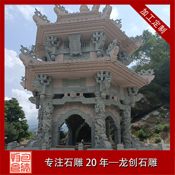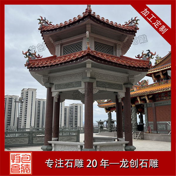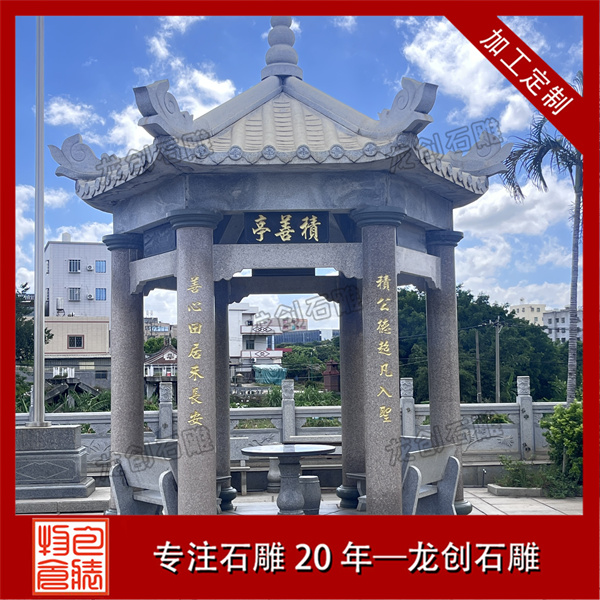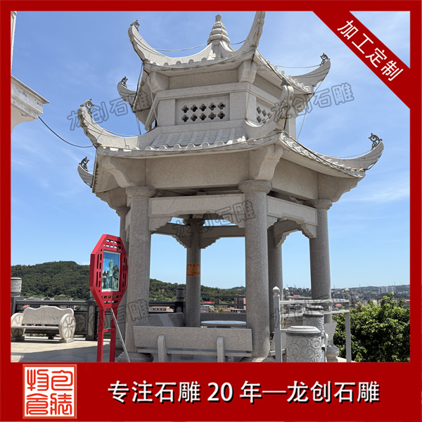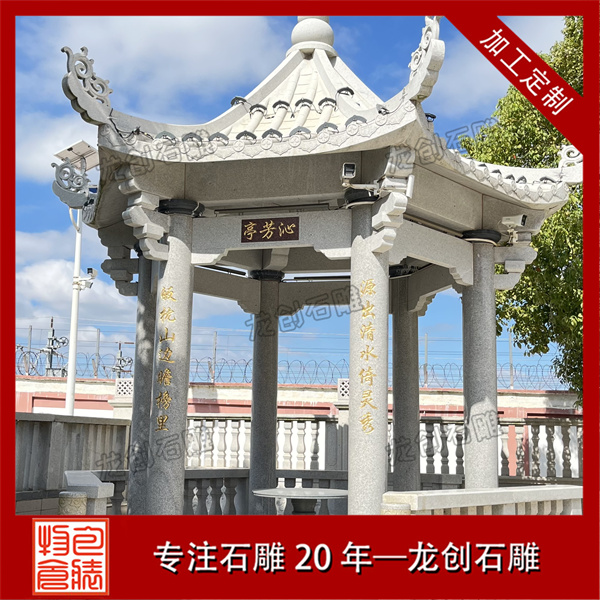 從工藝構(gòu)造來看,標(biāo)準(zhǔn)六角涼亭包含臺(tái)基、柱礎(chǔ)、檐柱、梁枋、屋面、寶頂六大組成部分。臺(tái)基常采用須彌座樣式增強(qiáng)穩(wěn)定感;六根檐柱通過精確的榫卯結(jié)構(gòu)與梁枋連接;屋面由六塊梯形石板精準(zhǔn)拼接形成流暢的排水斜面;頂部寶頂作為收束構(gòu)件兼具裝飾功能。雕刻工藝以淺浮雕為主,常在柱礎(chǔ)處飾以蓮紋,欄板處刻有簡(jiǎn)化的幾何紋樣或自然圖案,保持整體風(fēng)格的協(xié)調(diào)統(tǒng)一。