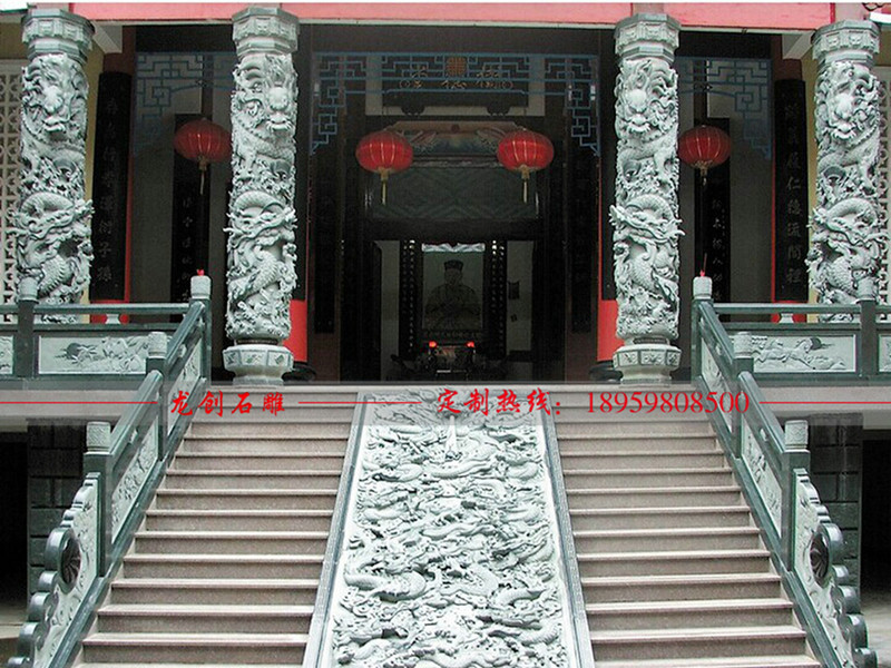 降龍柱,降龍柱的面部表情是非常特別的,有一種敬畏的感覺,一般來說,龍頭在下,龍尾朝上,這樣的龍有一種俯沖下來的模樣,這種龍柱表示整座建筑的主人有很強大的法力,可以讓龍下凡來守護這座建筑,寺廟就非常符合這樣的特點,所以一般來說,這種龍柱大多使用在寺廟,寺院,道觀,還有一些其他教的朝拜的地方等等。