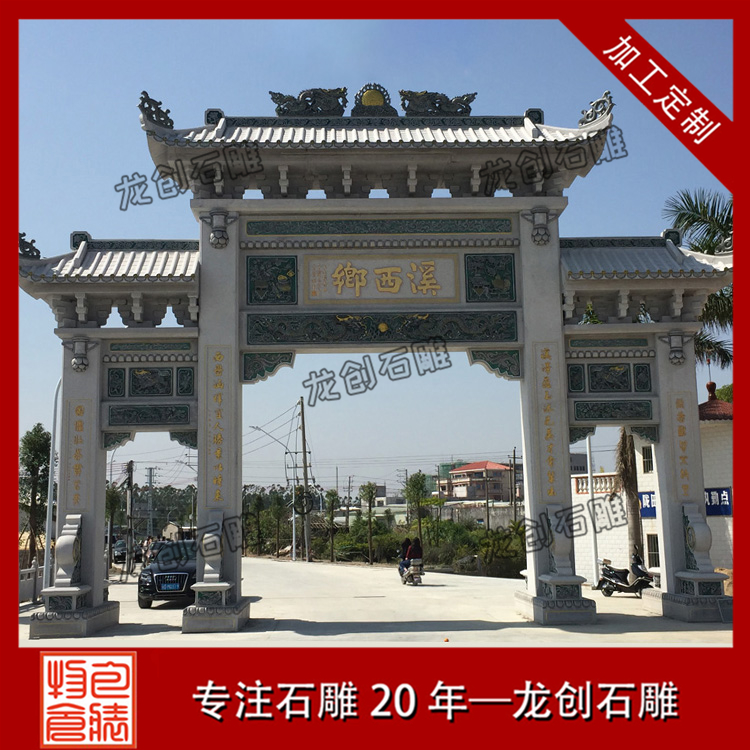 農(nóng)村大門牌坊定做當(dāng)然在材質(zhì)的選擇上都比較講究,為保障牌坊本身的美觀性和牢固性,在材料挑選上也都有非常高的要求。綜合現(xiàn)在牌坊的雕刻看,主要用料有青石、花崗石、大理石等,要說比較合適的牌坊雕刻用料,還是以花崗石為主,花崗石的材質(zhì)比較堅固,花色也都比較多,能夠雕刻出更為細(xì)致的村口牌坊作品。