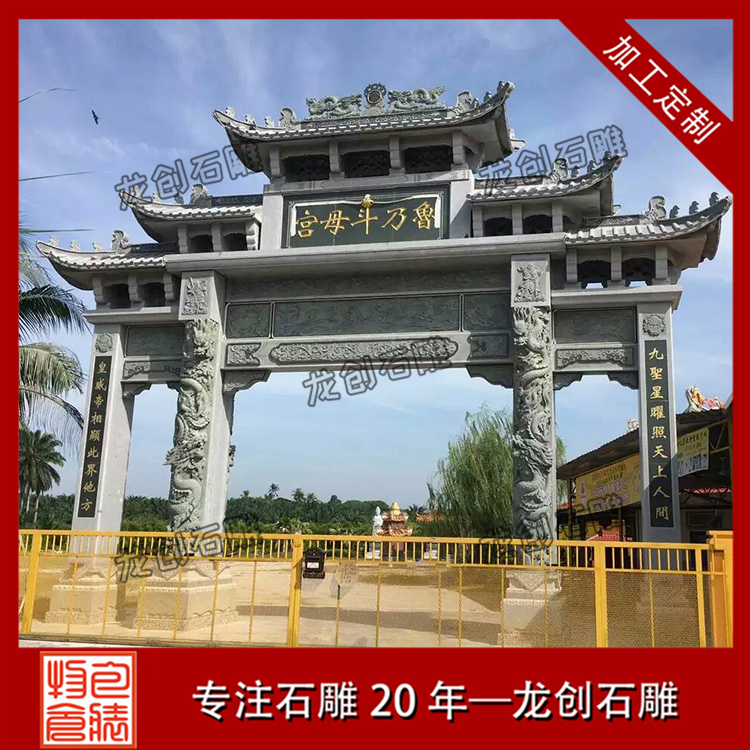 牌坊上經常看到浮雕龍在中國的傳統文化中是吉祥的象征,龍在云中翱翔,將優(yōu)美的姿態(tài)展現給世人看,線條流暢;寓意龍龍四海,還有石獅子抱鼓石有鎮(zhèn)宅等作用,花鳥、圖案、龍鳳及各種瑞獸等都有祥瑞之意,修建這樣的石雕牌坊大門,更能令村莊吉祥如意。龍創(chuàng)石雕專注牌坊制作20年,堅守工匠本心,將每一座牌坊制作都追求優(yōu)質。